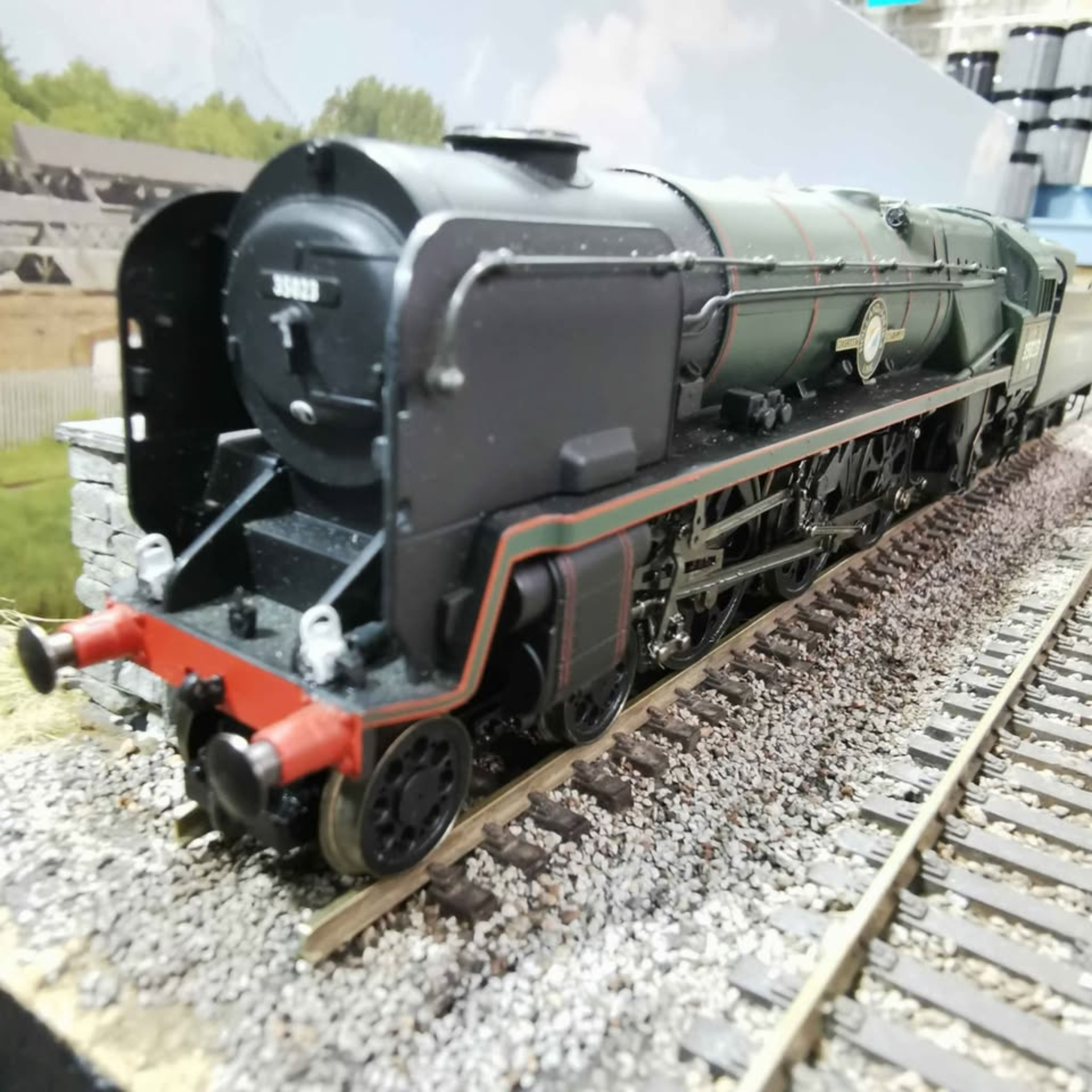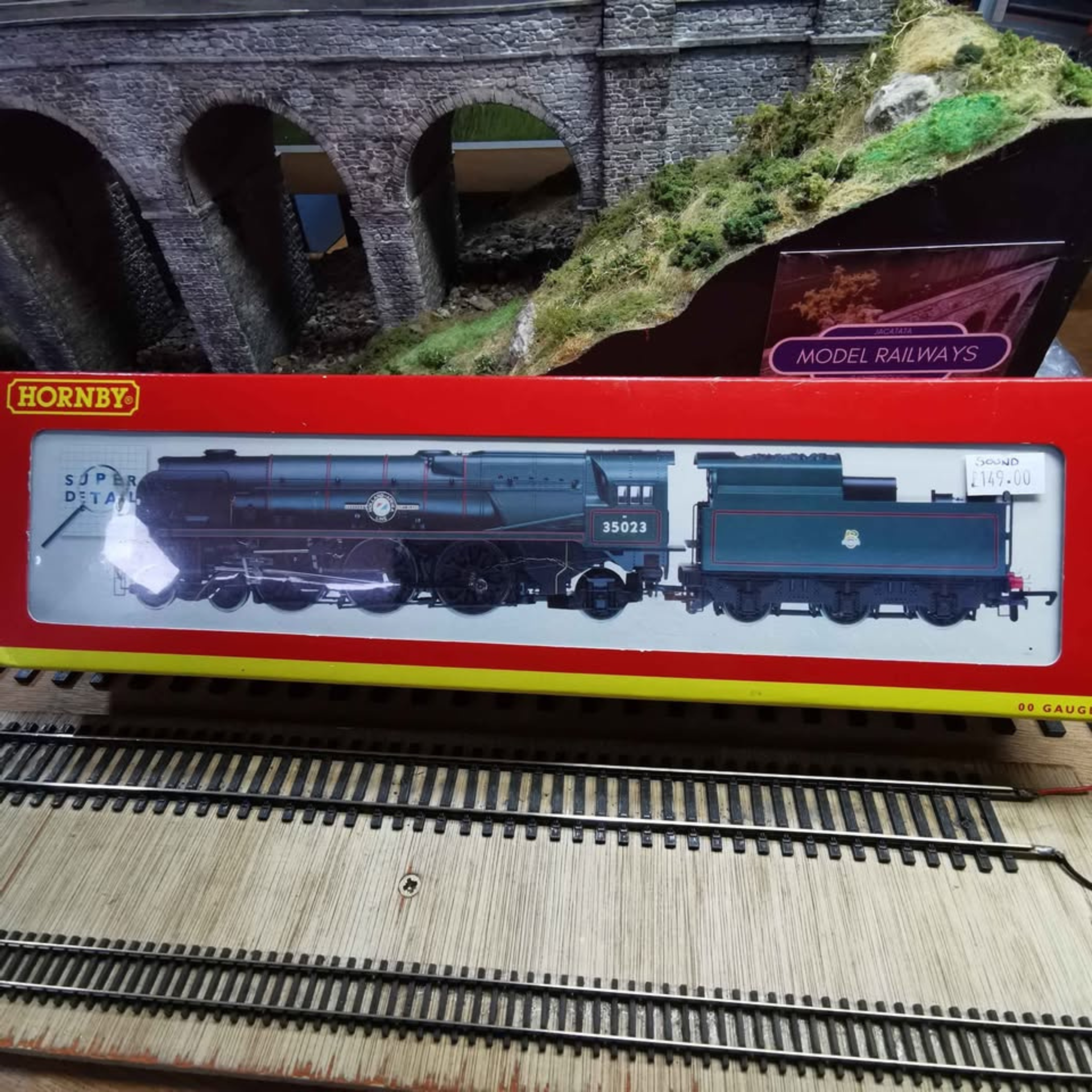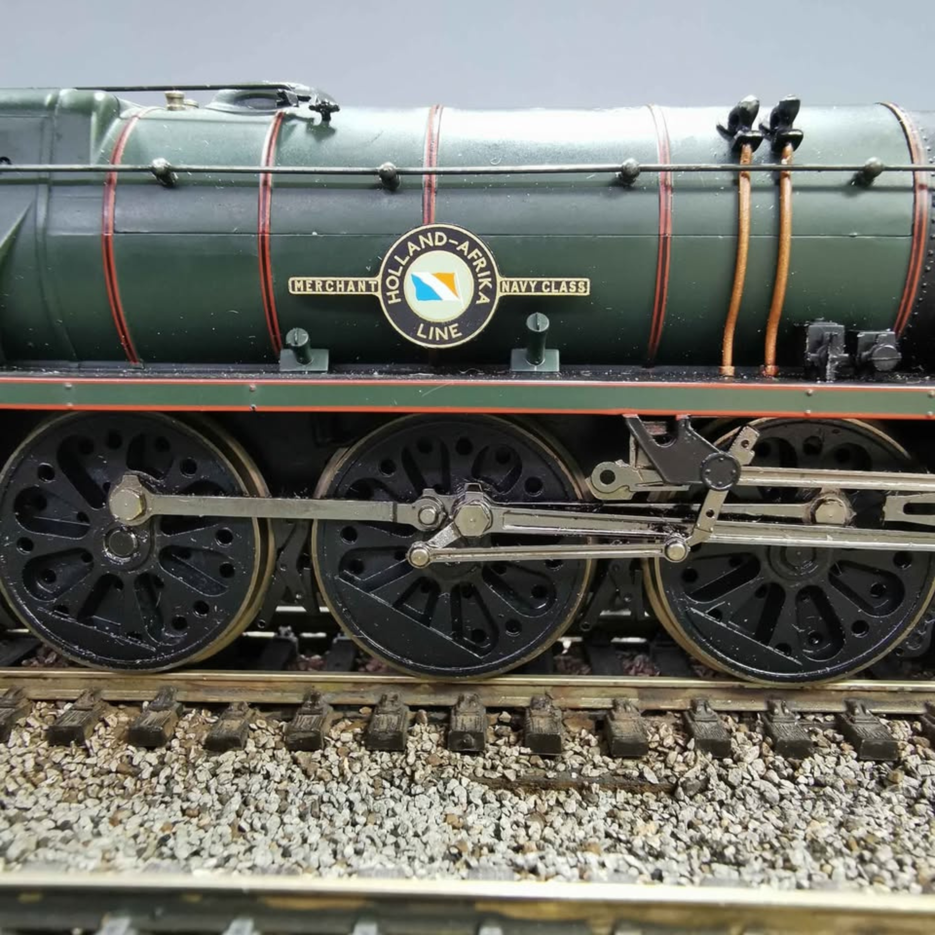 This pre-owned Hornby '00' gauge Merchant Navy Class locomotive, No. 35023 "Holland-Afrika Line," features authentic BR lined green livery with the early emblem. Equipped with working front lamps and firebox lights, this model is complete with all buffers and couplings intact. Tested for seamless operation at all speeds in both directions, it offers a refined addition to any collection, enhanced by detailed craftsmanship and DCC sound compatibility.
