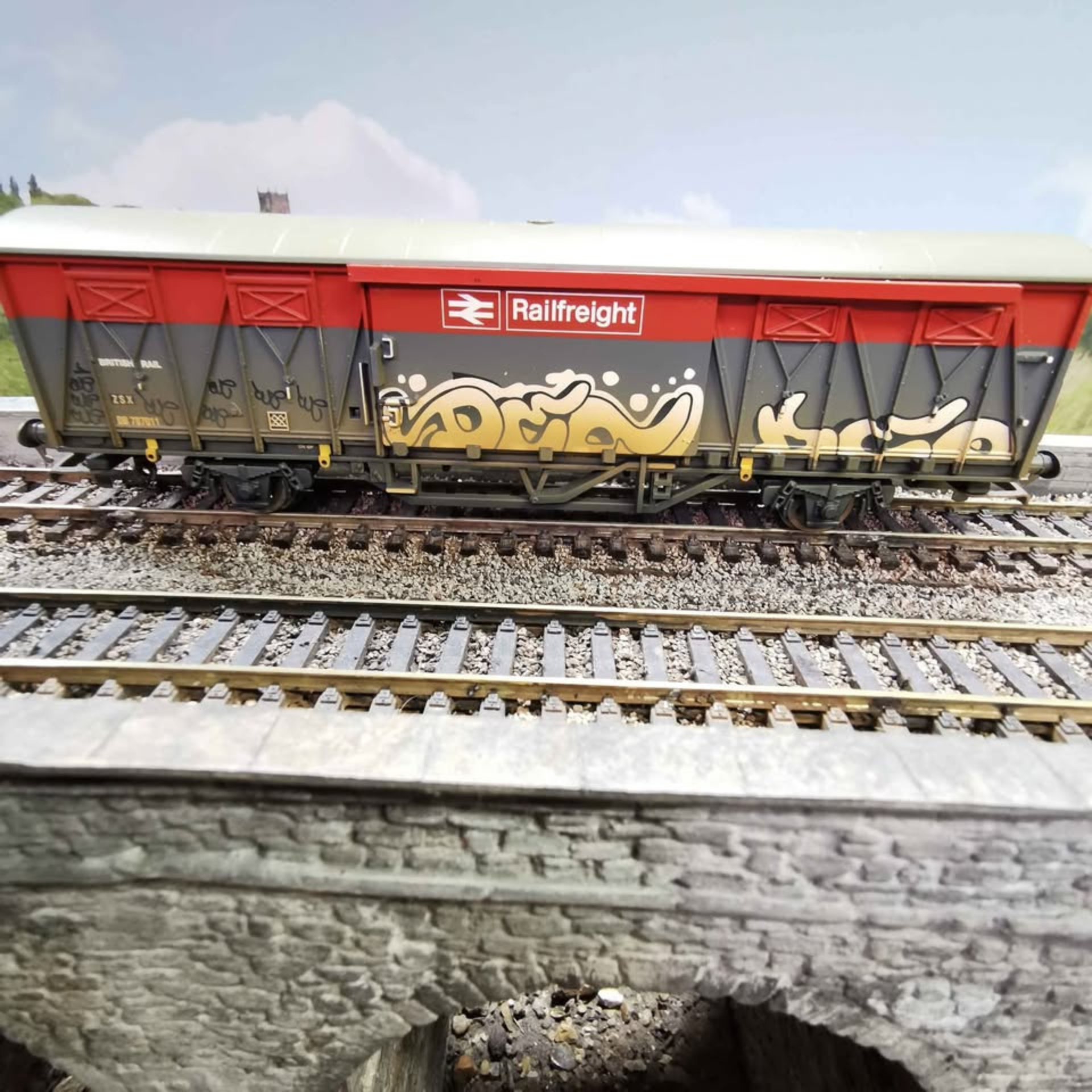 This detailed '00' gauge Hornby BR Railfreight ferry van model features authentic weathered graffiti, capturing the gritty realism of rail freight transport. Its precise livery and subtle aging effects add depth and character, making it an exceptional addition for serious collectors and model railway enthusiasts seeking realism and sophistication in their layouts.