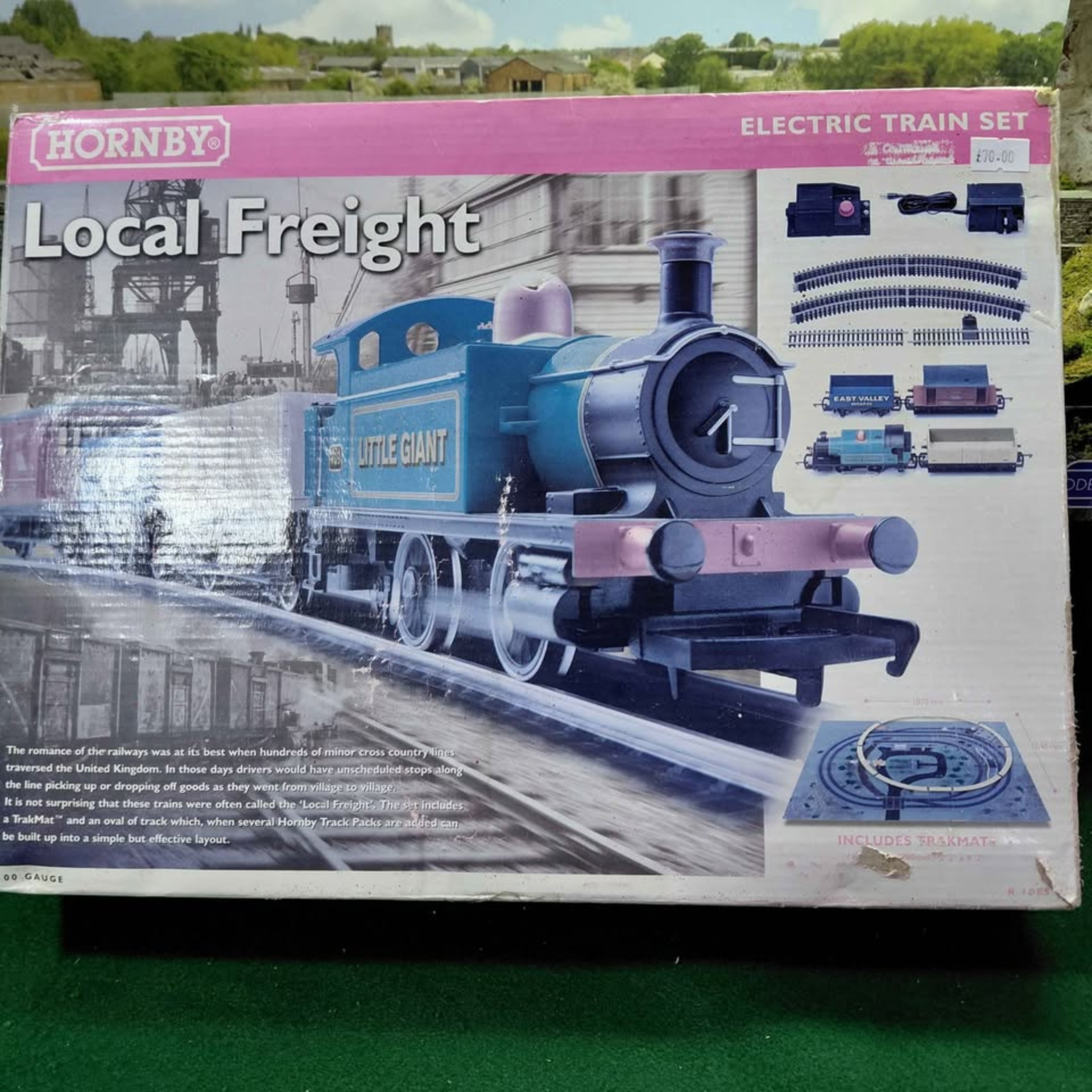This Hornby OO gauge local freight train set represents a classic introduction to model railway operation. The collection comprises a 0-4-0 tank engine paired with two freight wagons and a guards van, all mounted on an oval track layout. The set includes everything required for immediate operation: a controller, power pack, and trakmat base. Each component functions flawlessly, ensuring reliable performance for both seasoned enthusiasts and newcomers to the hobby. Whilst the original packaging shows signs of age and wear, the contents remain in excellent working condition, offering genuine value for those seeking an authentic, ready-to-run railway system.